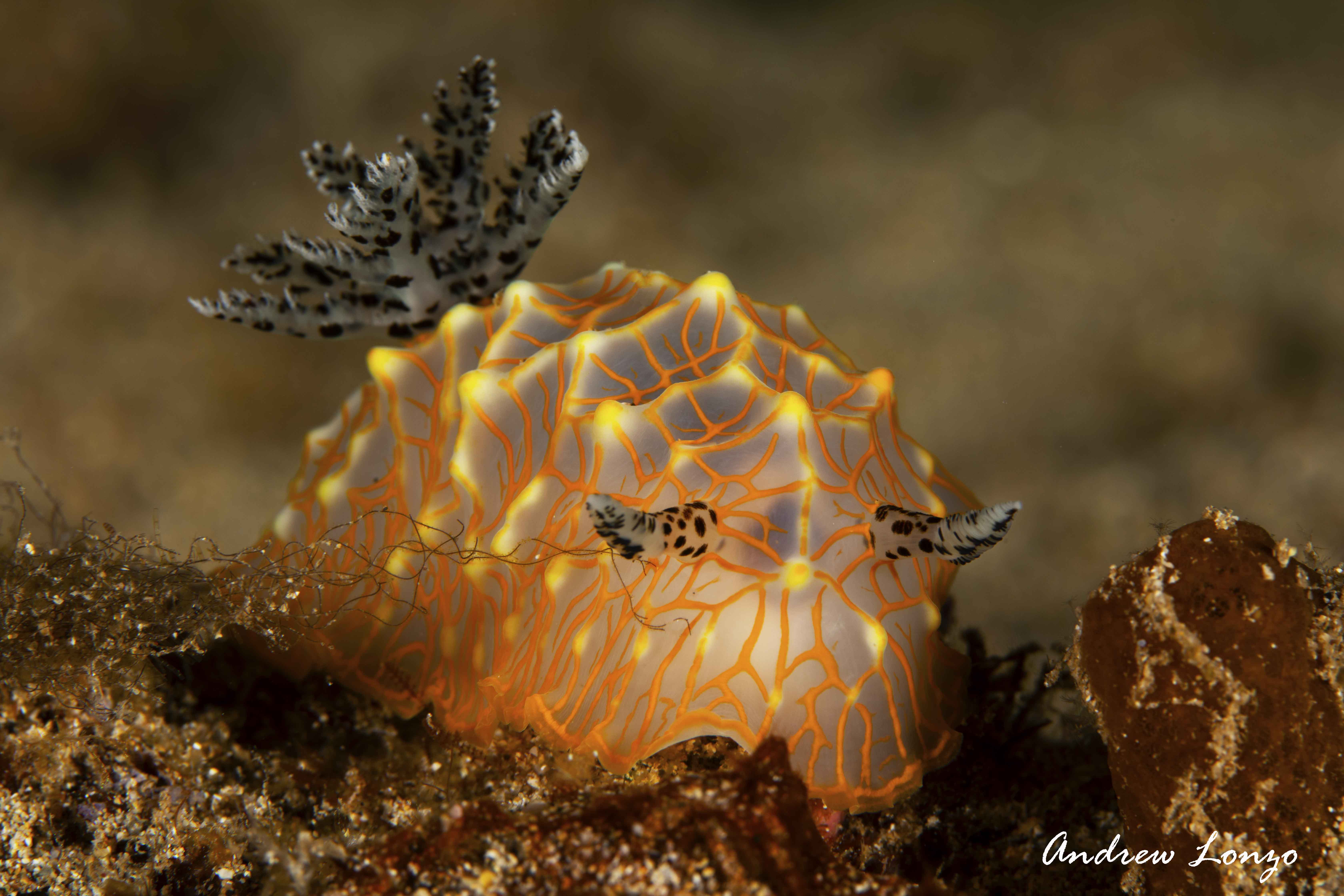 Part of our Beauty Discovered series. This Gold Lace Nudibranch was eating larvae on a small rock at dusk far from shore in Maui Hawaii. Shot with Canon 5D Mark IV in a Nauticam Houseing, with Kraken Mini Flare video lights, and Sea & Sea YSD2 strobes. Take our photography class to learn how to capture breathtaking memories of your own discoveries.